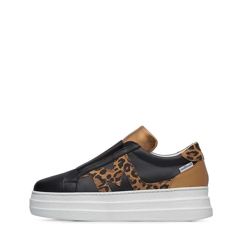 Available in three versions: black leather with leopard-print suede inserts and bronze metallic details; white leather with leopard-print suede inserts and gunmetal metallic details (glitter effect on the heel); white leather with contrasting black details.