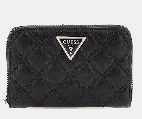 Expertly designed, the Guess- Giully Zip features a quilted faux leather outer for a sleek and stylish look. The zip closure and pale gold hardware add a touch of elegance, while the integrated coin purse and credit card slots offer convenience and organization. Complete with a metal triangle logo on the front, this wallet is a must-have for any fashion-forward individual.