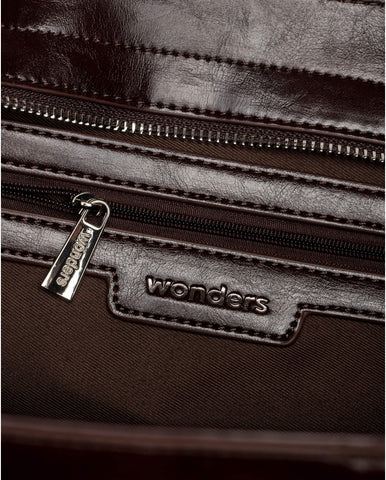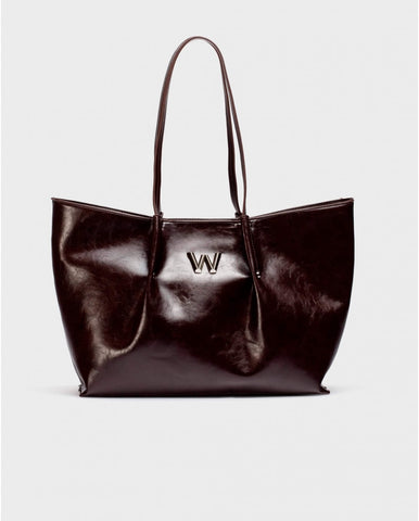 NAYSA shopper bag in brown. This large, structured model features double handles for a comfortable fit over the shoulder. The metallic “W” on the front adds a touch of elegance. The main compartment includes a zipper closure for added functionality and security. A perfect pairing with your Wonders shoes. Size: 34x27x12 cm.