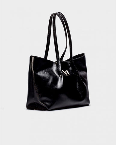 NAYSA shopper bag in black. This large, structured model features double handles for a comfortable fit over the shoulder. The metallic “W” on the front adds a touch of elegance. The main compartment includes a zipper closure for added functionality and security. A perfect pairing with your Wonders shoes. Size: 34x27x12 cm.