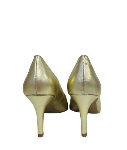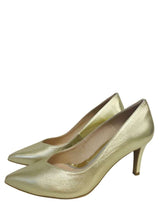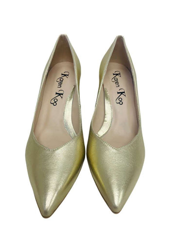 Indulge in elegance with the Karen Koo Gold Court Shoe - 6047GLD. Crafted with metallic gold leather and a sweet-heart cut at the front, this shoe is perfect for any occasion. Dress it up or down for a touch of sophistication and style.