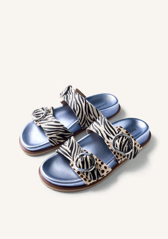 Leather sandals with an animal print and buckles. They feature a bio-textured sole lined with metallic leather, ergonomically designed to distribute weight evenly. Leather upper, lining, and insole. Lightweight EVA sole.