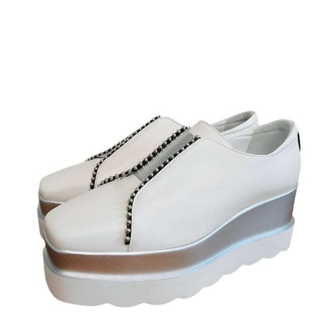 With its elegant, clean lines, it's made super feminine by the long, tapered toe and the soft nappa leather.The two-tone platform features a striking platinum insert, contrasting with the white single-block rubber sole with a wavy profile.