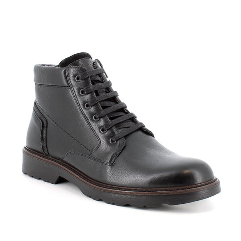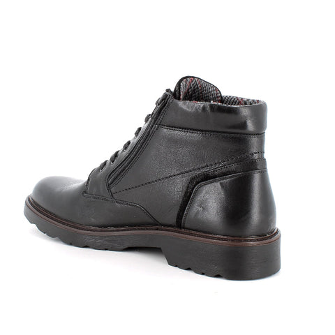 Lighter, more flexible, more space, more shock absorption. Men's ankle boot with upper in  leather, and breathable, laces on the front, visible stitching, fabric lining with genuine leather insole, padded ankle, non-slip rubber sole.