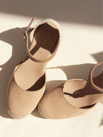 Beige leather espadrille with a natural jute wedge. Ankle strap and adjustable buckle.  The insole is padded with foam, making it incredibly comfortable!