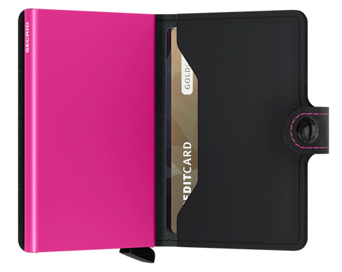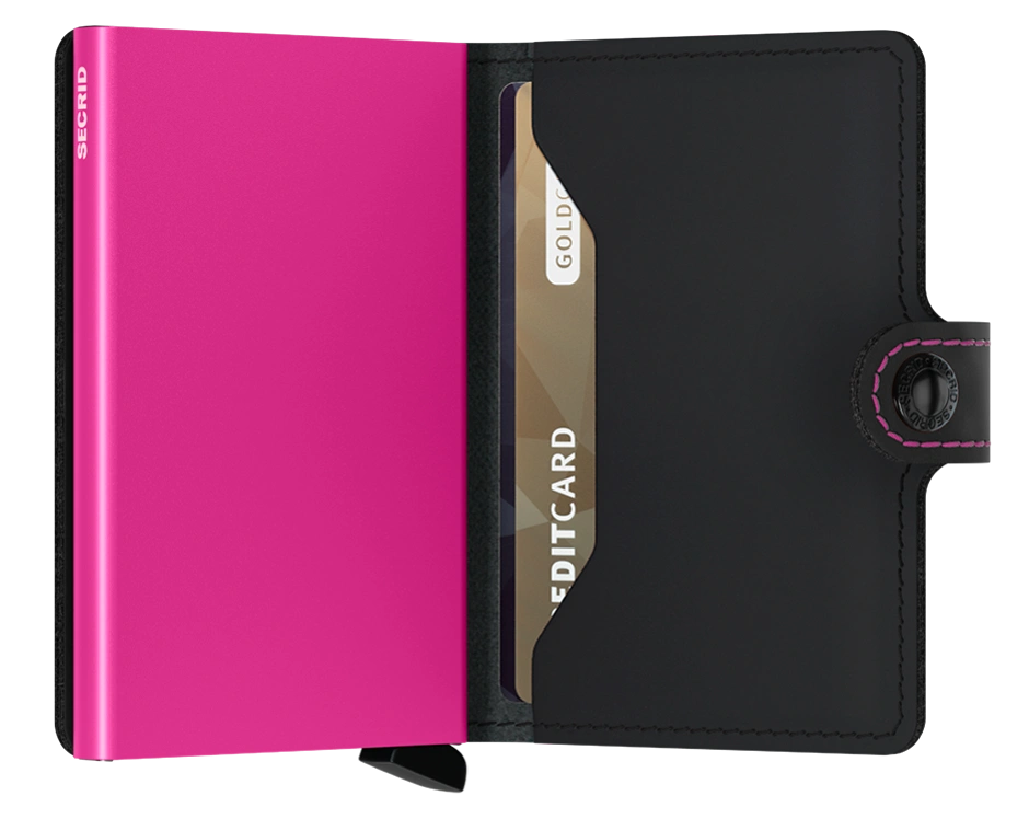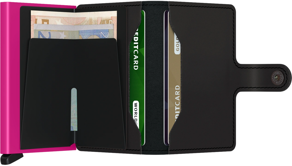 Small in size and surprisingly large in storage capacity, the Miniwallet combines the best of both worlds. The exterior holds banknotes, receipt and cards, while the aluminium Cardprotector allows you to slide out cards with one simple motion and protects them from bending, breaking and unwanted wireless communication.