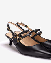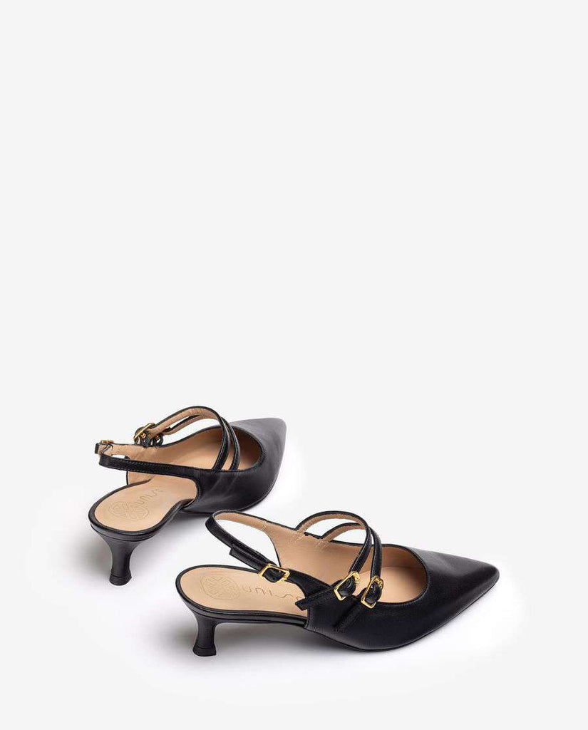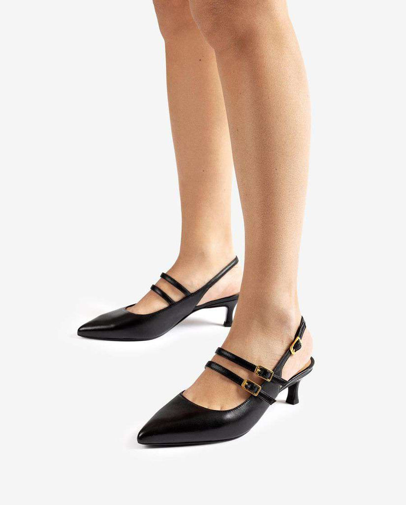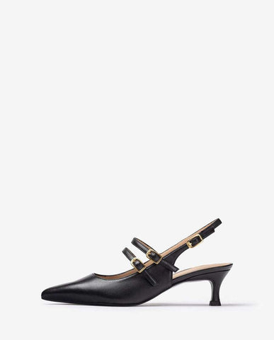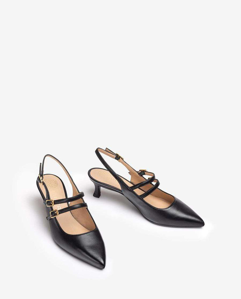 - Made in: Europe, Pointed toe slingback shoe made in leather. 5cm heel covered in a matching tone of leather and a leather sole. Double strap trim with buckles on the vamp.