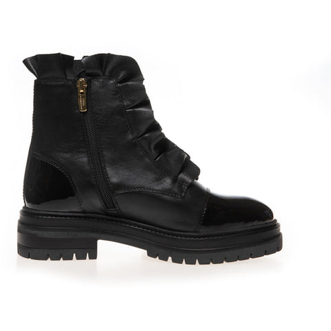 An exclusive version of the popular boot - here in black leather with patent details on the toe and back piece. The shiny finish gives a modern and sophisticated look that elevates any outfit. The ruffle edge and front lacing complete the feminine expression, while the zipper on the inside provides easy access.