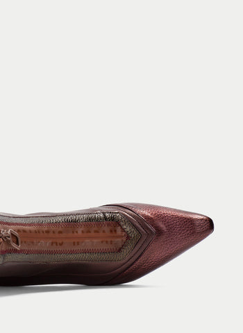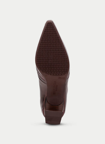 Pointed-toe ankle boot with a watertight zipper for easy slip-on.br /> Lightweight 1 cm platform and comfortable 7 cm geometric heel with a wood grain finish.