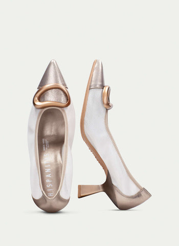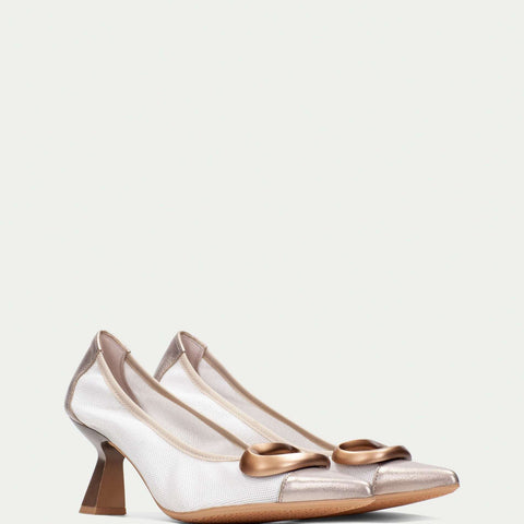 Shoes with mesh design, translucent heel and chain-link embellishment on the toe. This shoe incorporates TRIFLOW technology, which cushions each step providing flexibility and comfort, thanks to its triple cushioning.