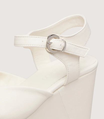 Minimal and contemporary, this platform wedge sandal is designed to elevate everyday style with effortless sophistication. Crafted from smooth light cream leather, it features a softly draped upper and an adjustable ankle strap finished with a silver-tone buckle for a refined touch.
