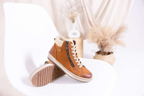 Ladies' Rieker tan brown everyday ankle boot. These ankle boots feature a fun collar as well as a zip and lace closure for added support.