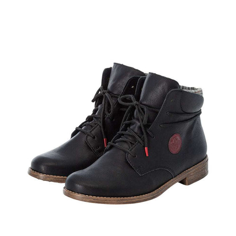Ladies' black zip-up boots with both side zip and laces. Boots feature a distressed look and a trendy material collar for the ultimate look!