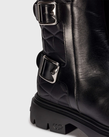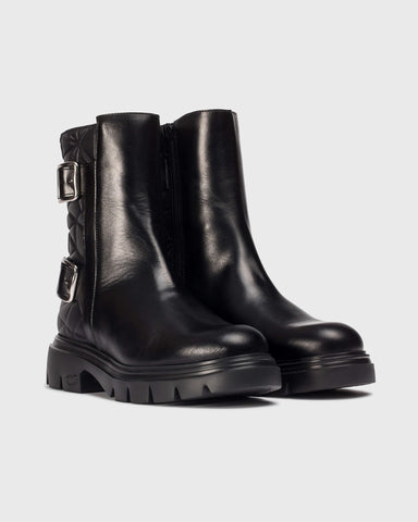 These ankle boots merge edgy biker aesthetics with refined femininity. Crafted from premium leather and textile in sleek black, these boots feature a distinctive padded rear panel with geometric detailing and metallic buckles for visual impact. The inner zip fastening ensures effortless on-and-off convenience. Engineered with FlyGrip technology, the sole delivers exceptional lightness, superior shock absorption, and reliable grip. The MemoryGel insole contours to your foot's unique shape, providing personalised comfort throughout the day. A versatile everyday essential that balances edge with elegance.