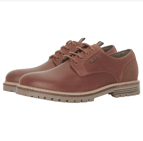 A plain toe Derby shoe with a canvas heel counter on a chunky Barbour branded cleated outsole.