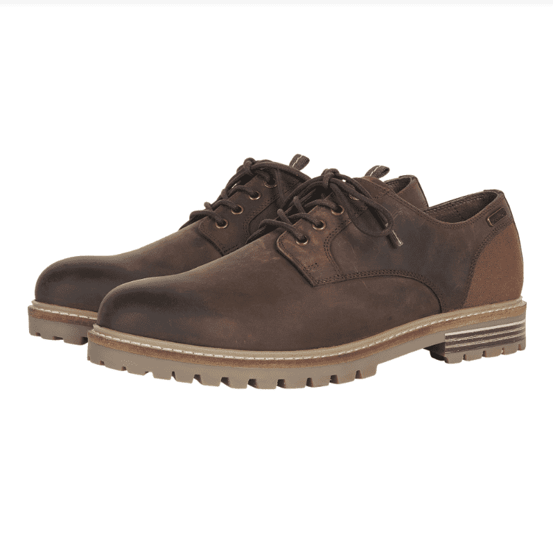 A plain toe Derby shoe with a canvas heel counter on a chunky Barbour branded cleated outsole.