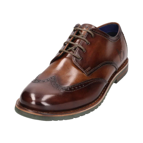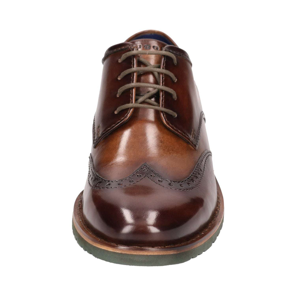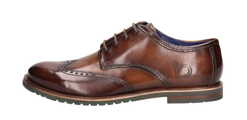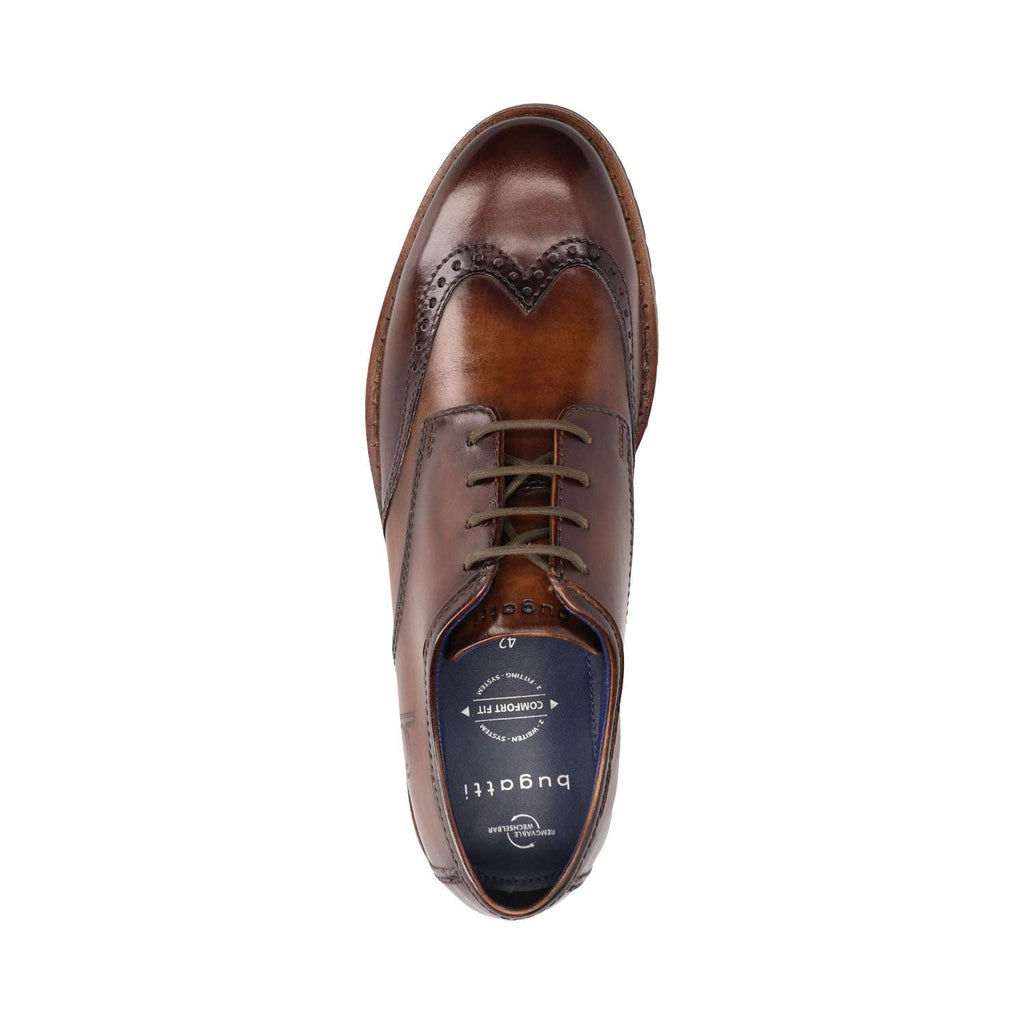 The Bugatti 312AIQ0160 is a formal lace-up shoe with a round toe and brogue detailing. This versatile shoe is designed for both day and evening wear, featuring a two-tone brown color and a durable rubber sole. It is the perfect addition to any wardrobe.