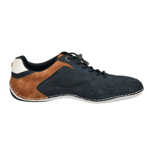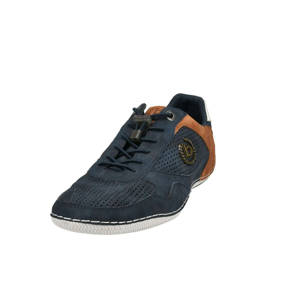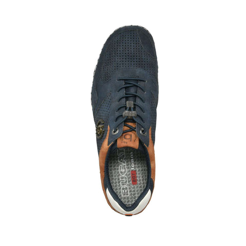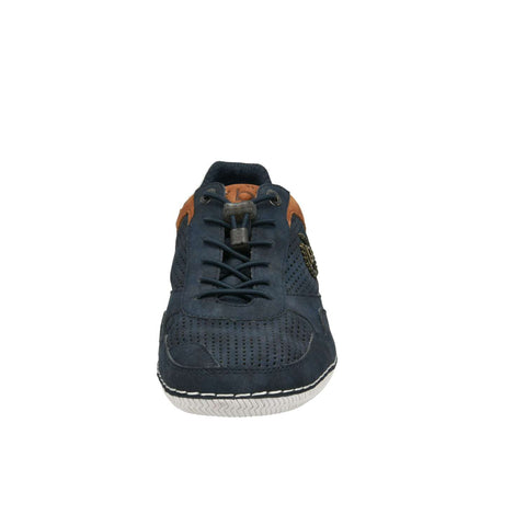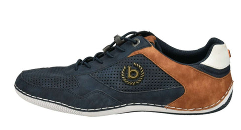 The Bugatti 3214801041-Trainer boasts a navy color scheme and features contrasting tan and white leather on the heel and sides, resulting in a sleek and modern flat trainer.