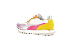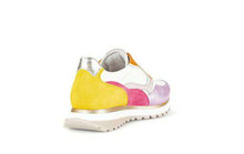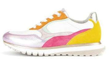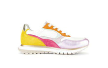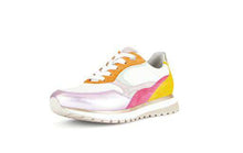 This Gabor trainer offers a wide and comfortable fit, thanks to its COMFORT wide range and OPTIFIT reversible insole. The sneaker features a material mix of leather and Foulard/Velour, with an offwh/gum/sole k.Color in a multicolour design.