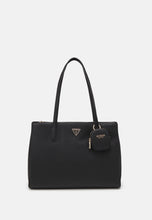The Guess Power Play Tote boasts a sleek faux leather design with a flap and double-button closure for added security. Its gold hardware and logo charm add a touch of sophistication, while the back zip pocket provides convenient storage. With a metal triangle logo and sturdy construction, this tote is a stylish and practical choice.