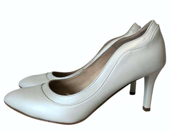 These Karen Koo¶ÿheels feature a pearlised off-white upper, a very flattering tone-on-tone scalloped edging and a 3-inch heel. It features a gel insole and leather lining for the utmost comfort.