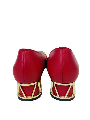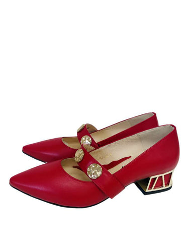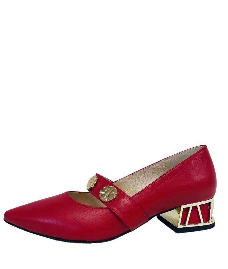 Elevate your style with the Karen Koo Pump - 7963RD. This unique pump boasts a pointy toe design, an elasticated leather strap with gold accents, and matching gold features on the heel. Make a statement with this stylish pump that takes your look to another level.  Perfect for those moments when you can't wear heels but still want to look stylish and put together.