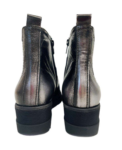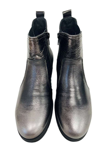 Step out in style and comfort with the Karen Koo Wedge Ankle Boot - 932008SL. Crafted from a crackled metallic leather, this lightweight boot is a must-have for all-day wear. With its comfortable sole, you won't want to take them off. Add a touch of uniqueness to your winter wardrobe with this silver boot boasting a 2 tone fading design.