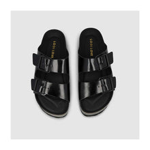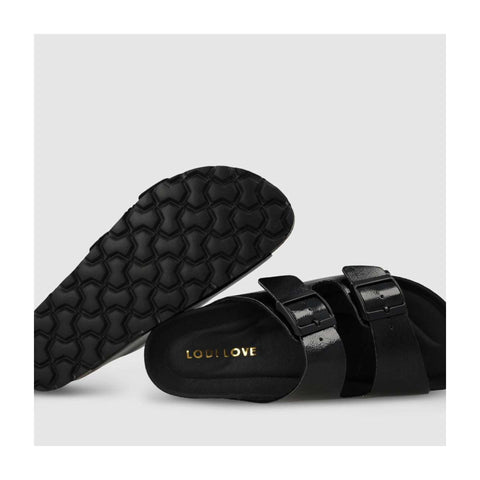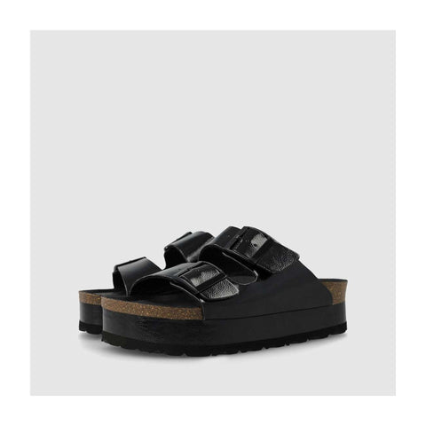 LODI BISEN women's platform sandals in black patent leather-effect fabric. A design made with a double adjustable strap with a matching buckle. Anatomical sole made of soft cork and 5.5 cm high rubber sole. Made in Spain.