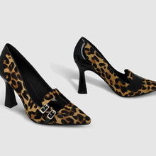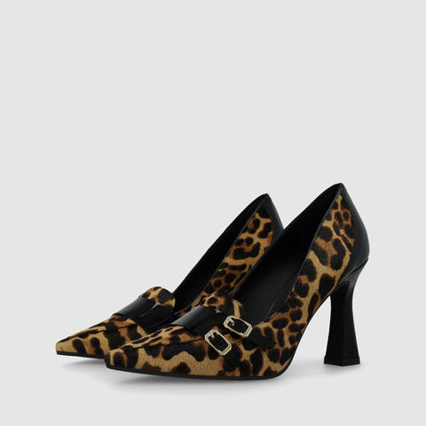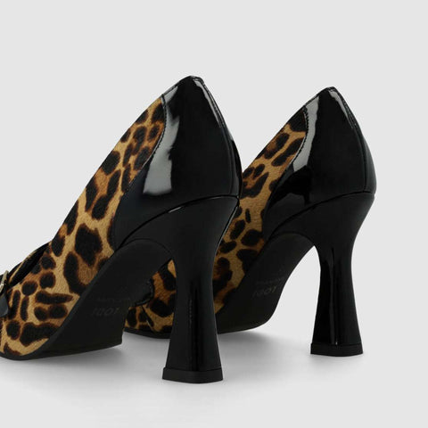 MORLAS-INO women´s pumps by LODI in leather combined with animal print. Detail of a band with metal buckles, elevating a basic design. A design crafted with a 9 cm geometric heel. Pointed toe and vamp detail. Leather-lined interior. Includes new gel insole for greater comfort in every step. Made in Spain.