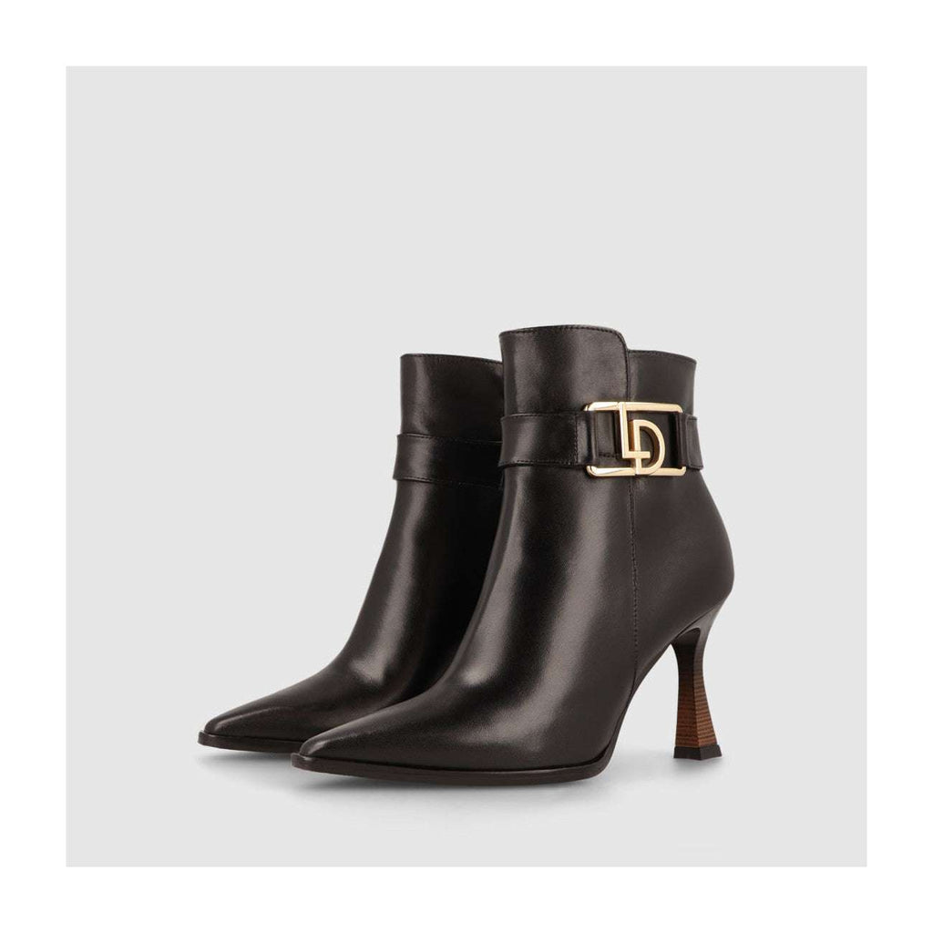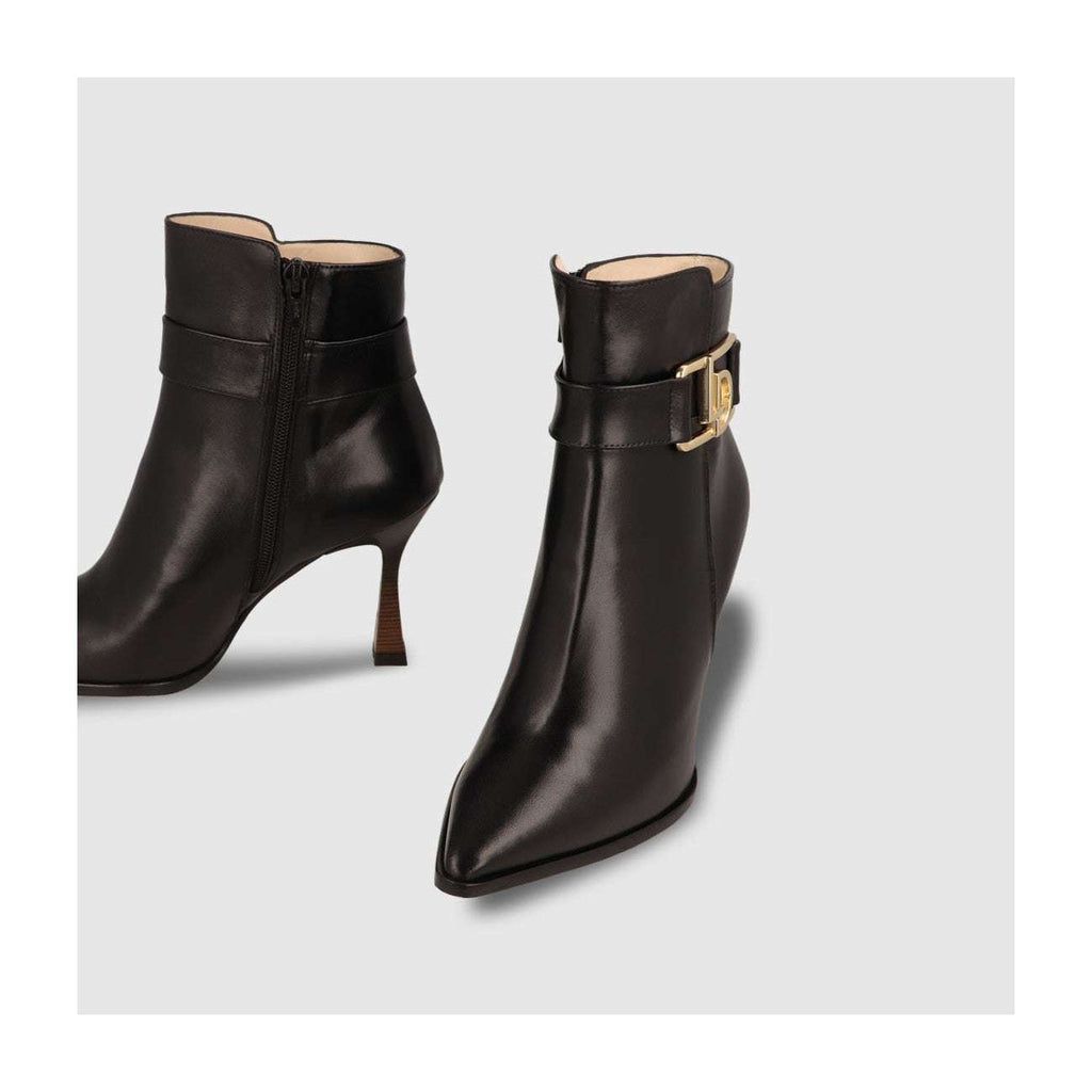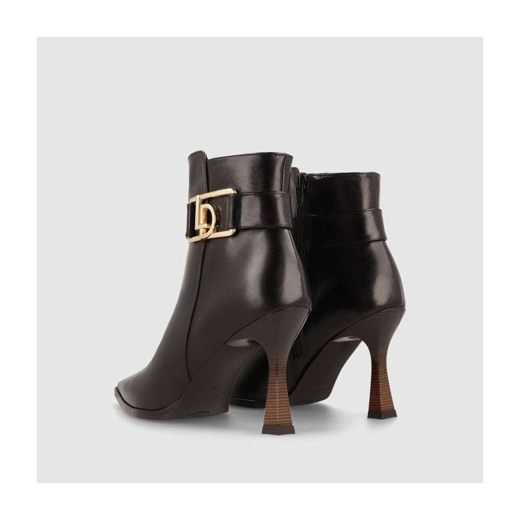 LODI MOSTON women's ankle boots in smooth black leather and applied detail in gold metal with the brand logo.¶ÿA design made with a 9 cm high geometric heel.¶ÿEnd point.¶ÿZipper.¶ÿInterior lined with leather.¶ÿIncludes a new gel insole for greater comfort in all your steps.¶ÿMade in Spain.