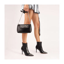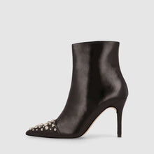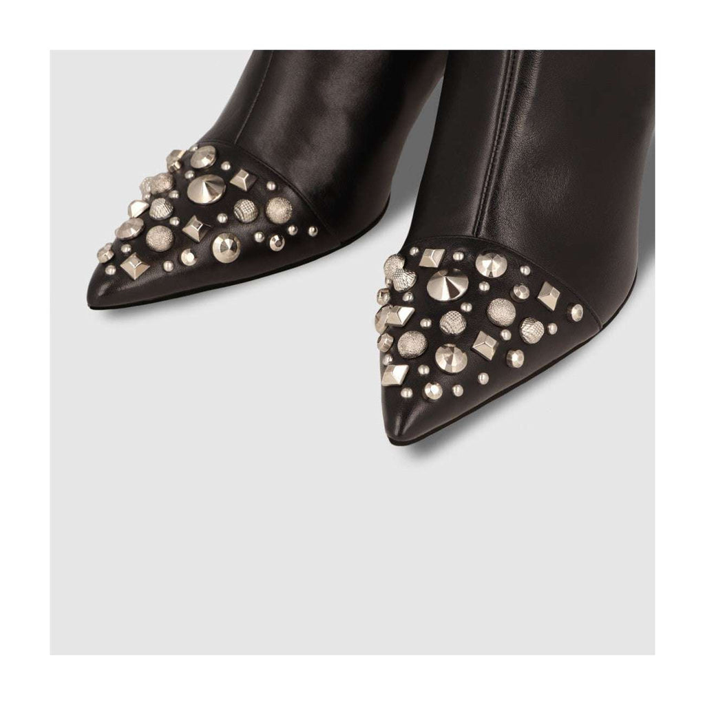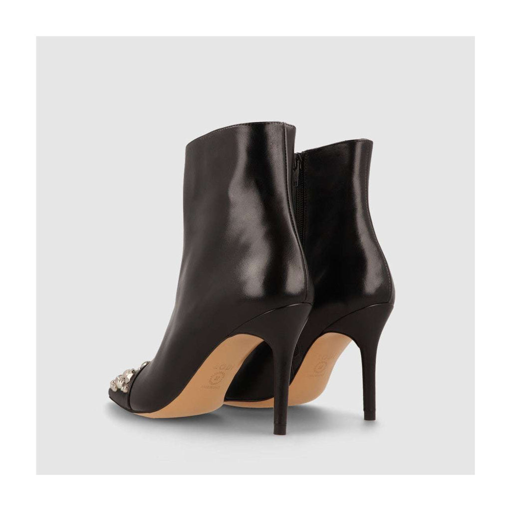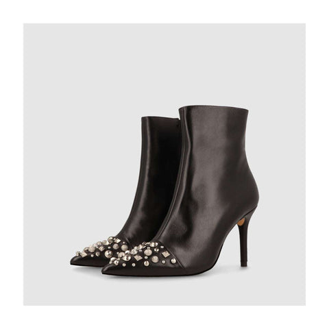 LODI SANDAR women's ankle boots in smooth black leather. The toe detail with silver metal studs stands out. It has a thin heel of 9.5 cm in height. Side zipper. Interior lined with leather. Includes a new gel insole for greater comfort in all your steps. Made in Spain.