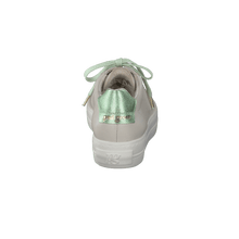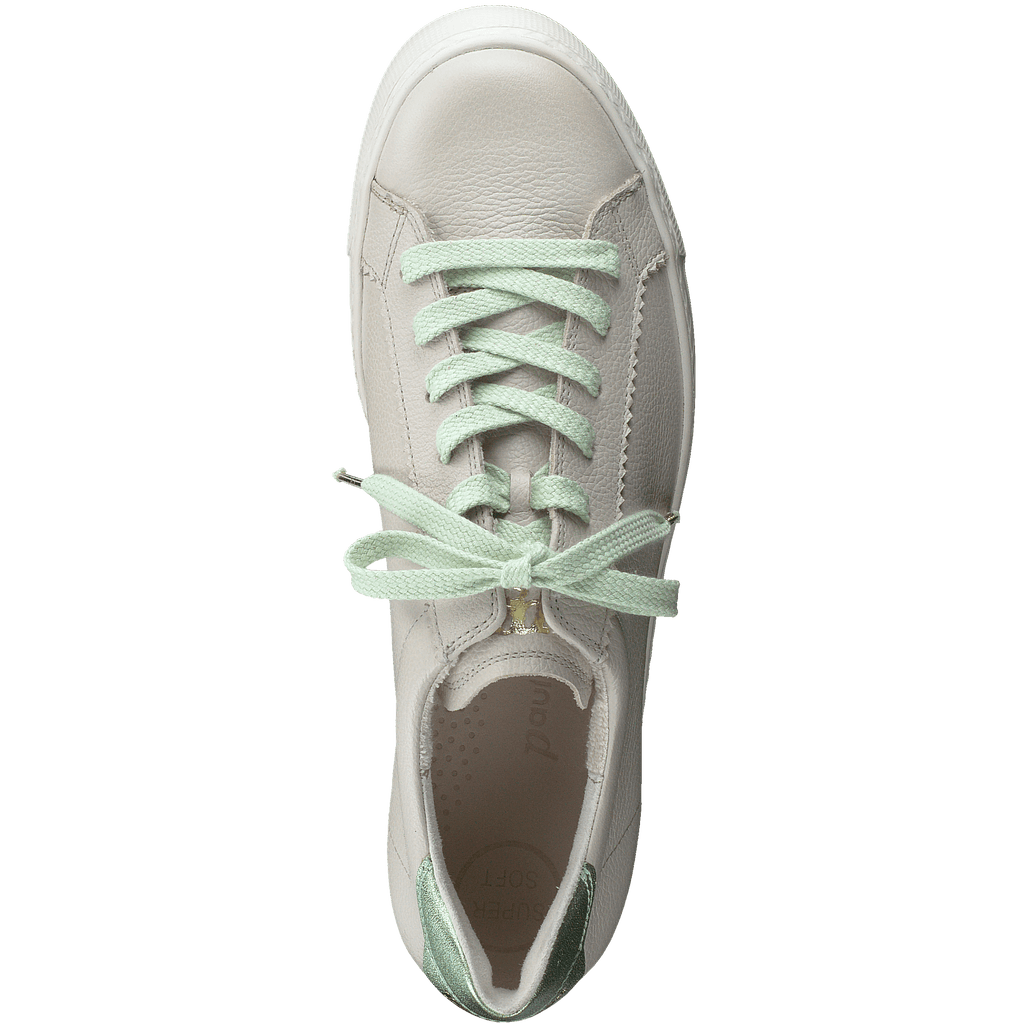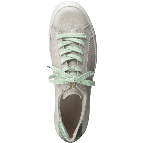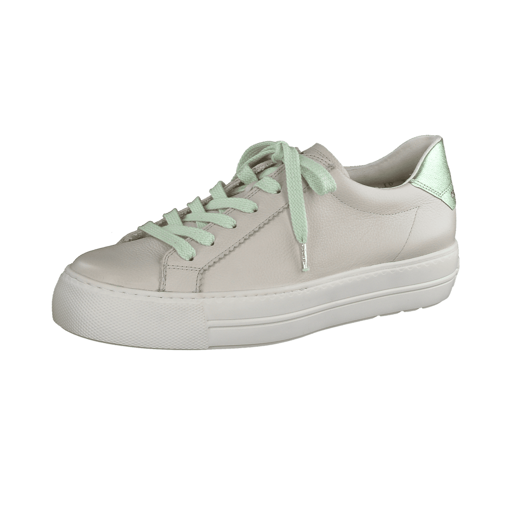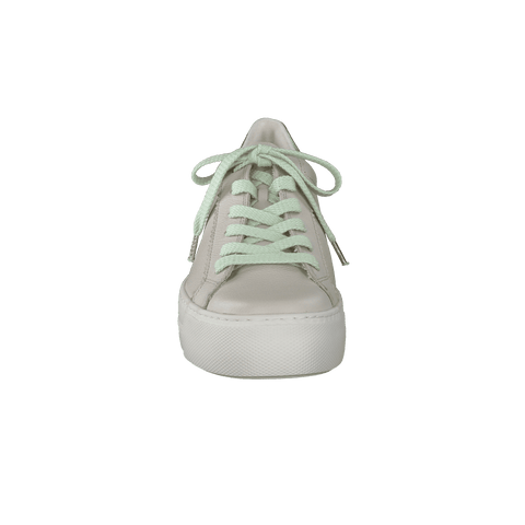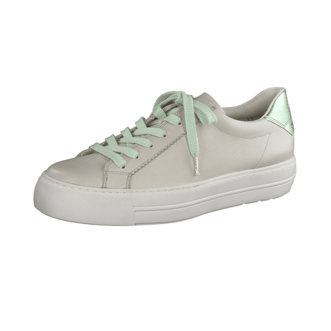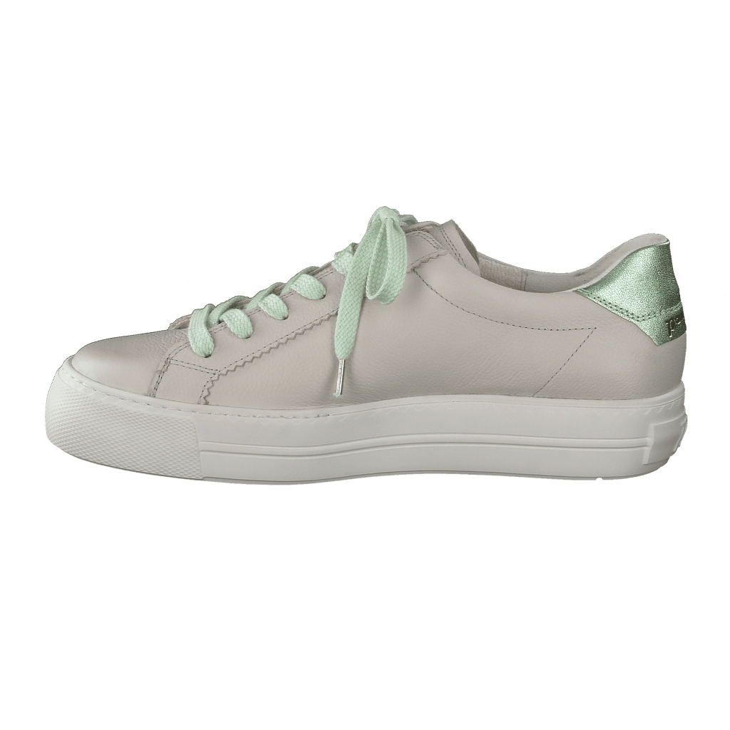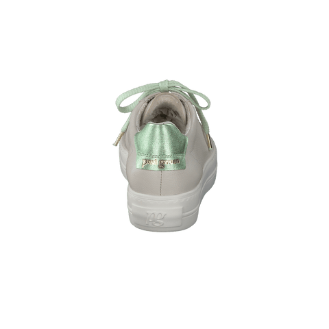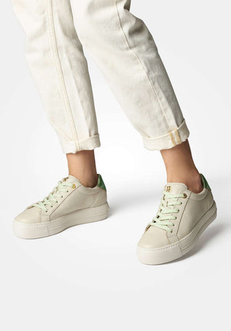 This product, the Paul Green 5241055- Trainer, has a smooth calf leather upper, rubber sole, and TENCEL™ fiber-lined leather inner lining. The 35 mm leather heel provides a SuperSoft and supple feel, along with a soft heel cap and a lightweight, flexible outsole. The foot-bed is also soft and breathable, and the shoe features a gold foil logo embossing, and zigzag stitching. The platform sole adds extra support. The colour is beige with green laces and a green metallic heel for a pop of contrast.