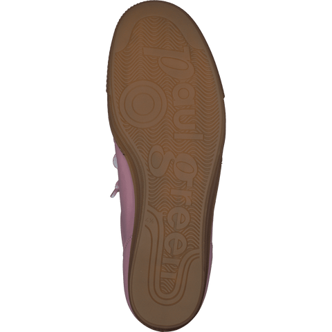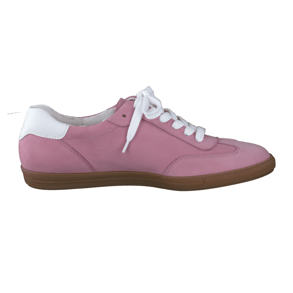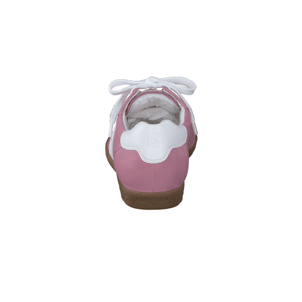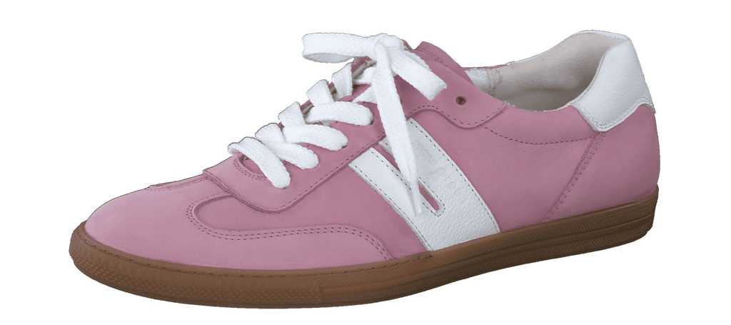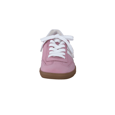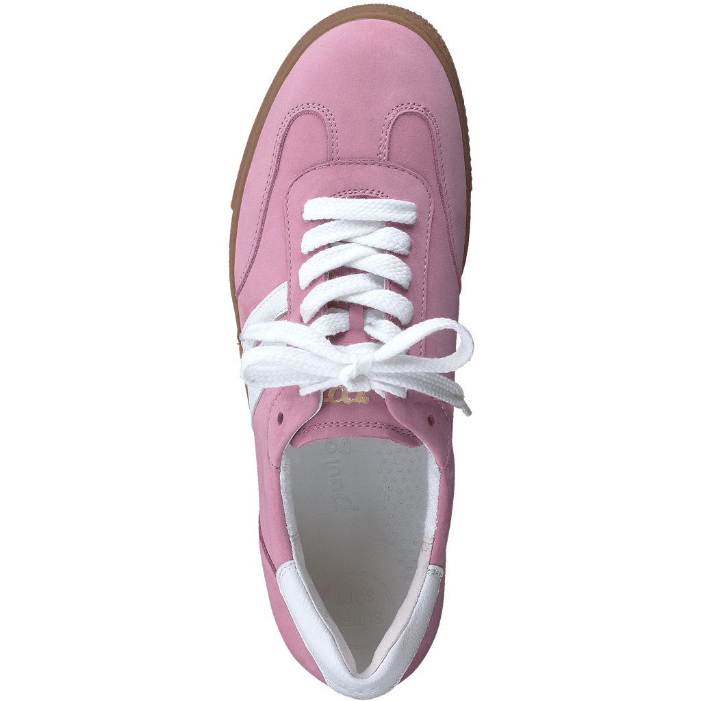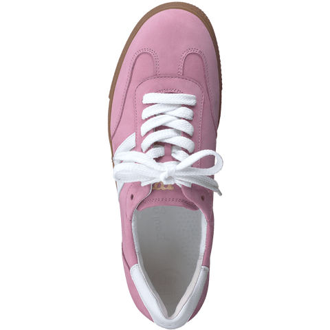 Crafted from a combination of fine-grained leather and suede materials, this pink Paul Green trainer features a breathable TENCEL™ fiber textile inner lining and a soft leather insole. Designed with a flat rubber sole and a supple leather heel cap, this shoe is both lightweight and flexible. Additional details include an embossed logo, decorative stitching, and a soft footbed for a casual yet stylish retro look. Perfect for those seeking a comfortable and trendy option.