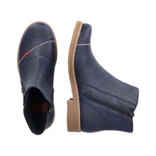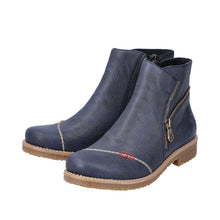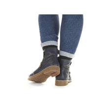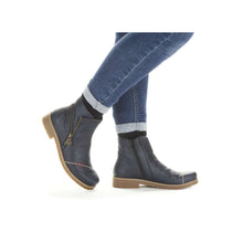 Dark blue ankle boots perfect for everyday wear. These boots feature a contrasting brown sole, a stitch detail around the sole and across the vamp as well as two side zippers, one being for style and the other functional.