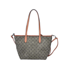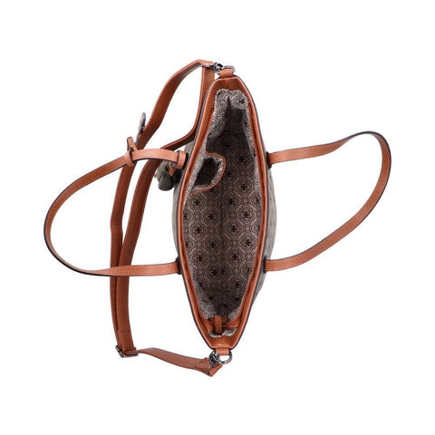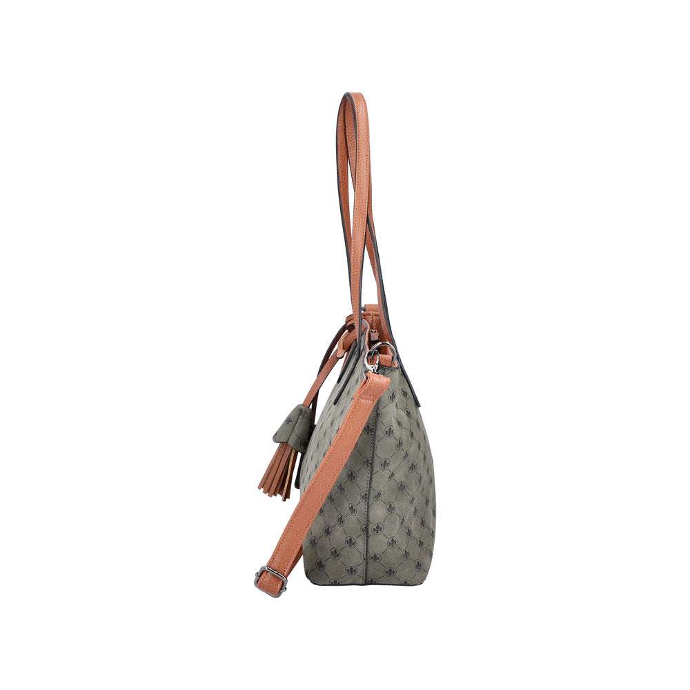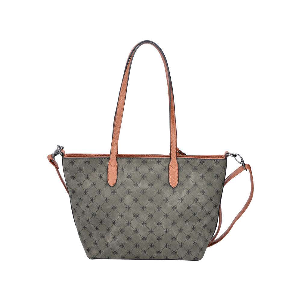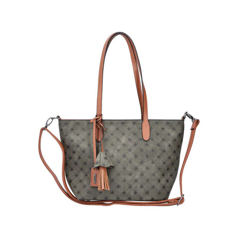 Green tote bag with Rieker logo pattern and tan brown accents. This bag features a double carrier strap and a longer adjustable cross body strap, a zip closure as well as a back zip pocket.