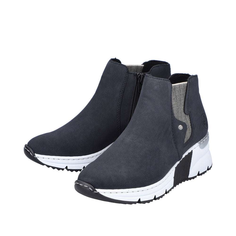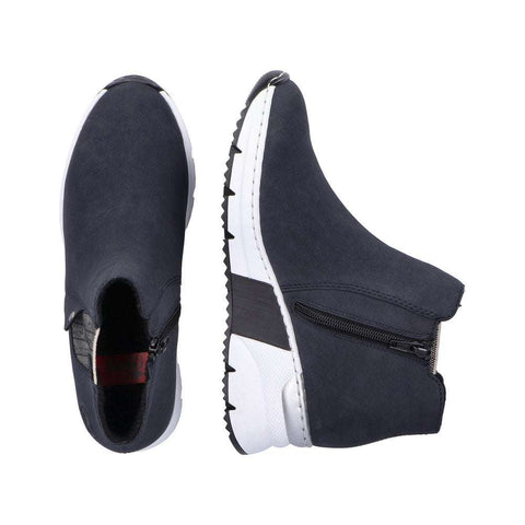 Ladies' blue suede wide-fit ankle boots. These ankle boots feature a grey elasticated side gusset as well as a side zipper for ease when putting on. They also have a two-toned contrasting white sole.