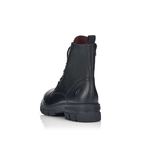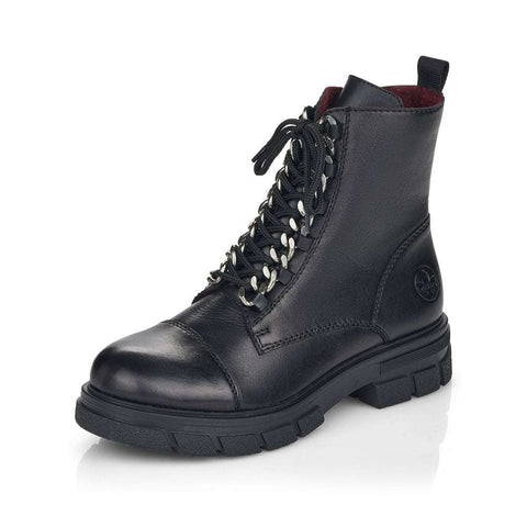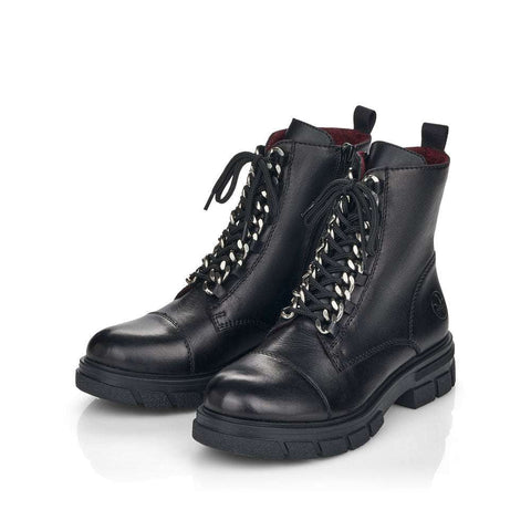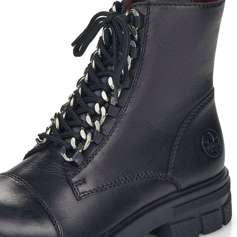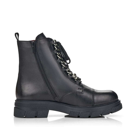 Ladies' black leather biker style boot with chain link detail eyelets. These boots give a classic combat boot style a feminine twist in the chain detail. The boots have a zip fasten for easier on/off, as well as a lace fasten for a personalised, more precise fit. The boots have a 2cm heel and a chunky, cleated sole. The black leather upper also features stitching detail.