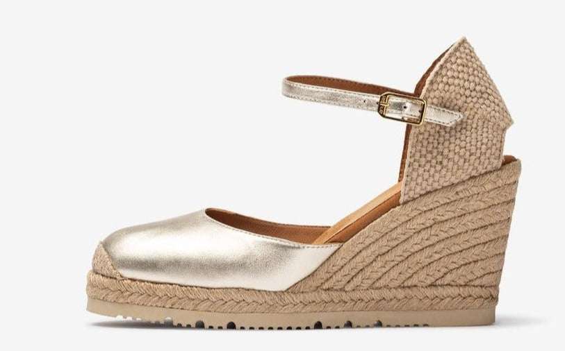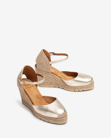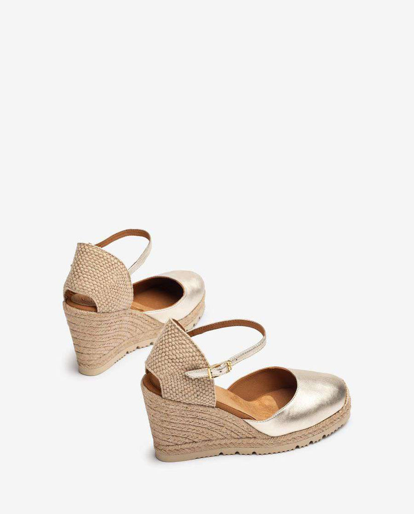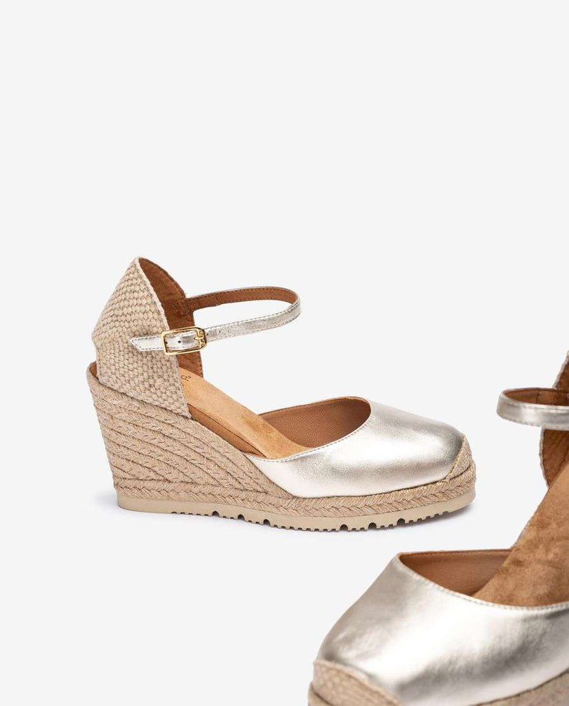 Round toe espadrille made in metallic effect leather. Raffia heel and an ankle strap that can be adjusted with the metal buckle.1cm platform and a 7.5cm wedge covered in jute. Lighter and more flexible EVA sole than ever before thanks to the Unisa Superlight technology. The design and the comfort of these espadrilles will surprise you!