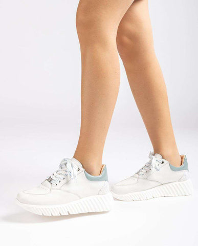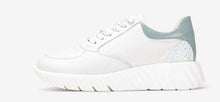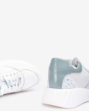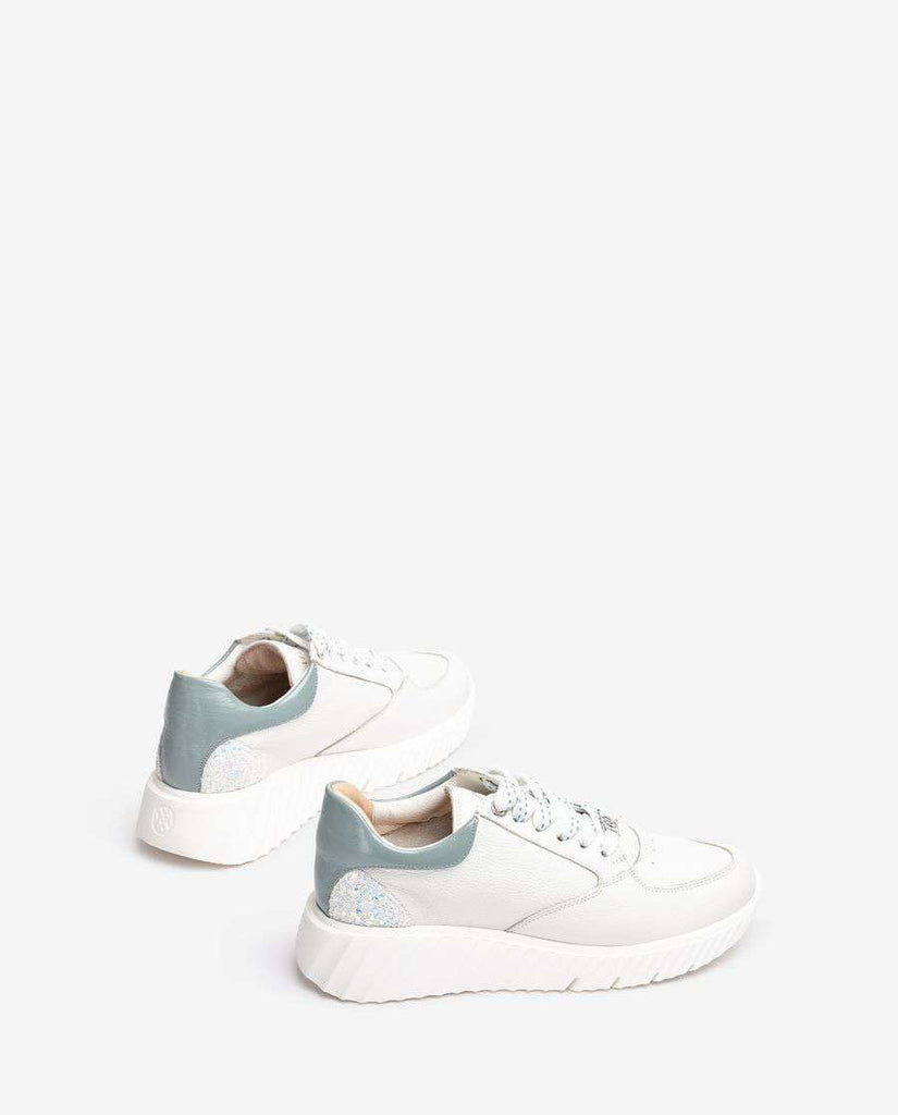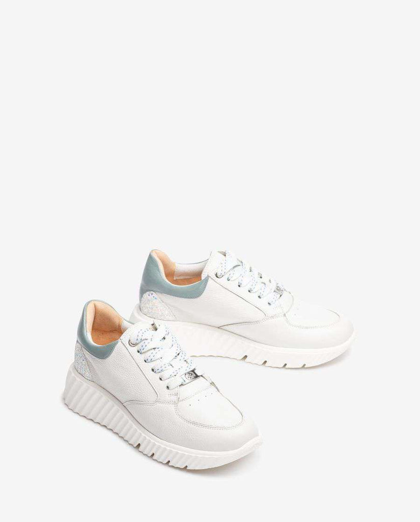 Leather sports shoe. Contrasting patent leather and glitter fabric ankle strap. Rubber sole with SuperLight volume and a removable insole. Matching tone laces.